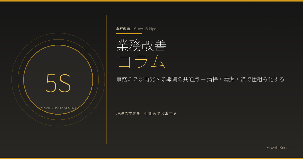 本シリーズでは、5Sの考え方を事務処理に応用する方法をお伝えしてきました。前回は「整理・整頓」で探し物のムダを減らす具体策をご紹介しました。今回は5Sの後半、「清掃・清潔・躾」を使って、事務ミスの再発を防ぐ仕組みをつくる方法をお伝えします。